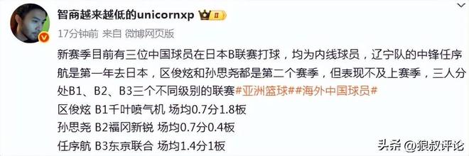 北京时间10月21日,根据媒体人“王健”的报道,新赛季目前有三位中国球员在日本B联赛打球,均为内线球员,辽宁队的中锋任序航是第一年去日本,区俊炫和孙思尧都是第二个赛季,但表现不及上赛季,三人分处B1、B2、B3三个不同级别的联赛。