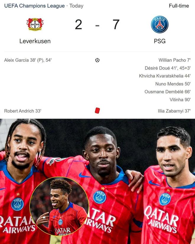 双方各被罚下一人:勒沃库森的安德里希与巴黎的扎巴尔尼均染红离场。易边再战,努诺·门德斯再下一城,加西亚一度将比分追成2-5。伤愈复出、自夺得金球奖后首次亮相的奥斯曼·登贝莱攻入第六球,维蒂尼亚终场前破门将比分锁定为7-2。