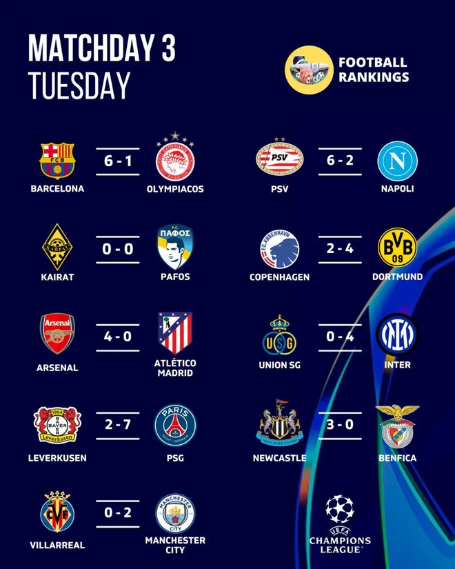 欧冠联赛阶段第3轮首个比赛日,各大豪门火力全开。在今日的9场比赛之中,除了阿拉木图凯拉特和帕福斯之间互交白卷之外,其余8场比赛狂轰43球,其中甚至还有巴黎7-2血洗勒沃库森、埃因霍温6-2大胜那不勒斯这样的比赛,而巴萨6-1击败奥林匹亚科斯的比赛进球数甚至都只能屈居第三。