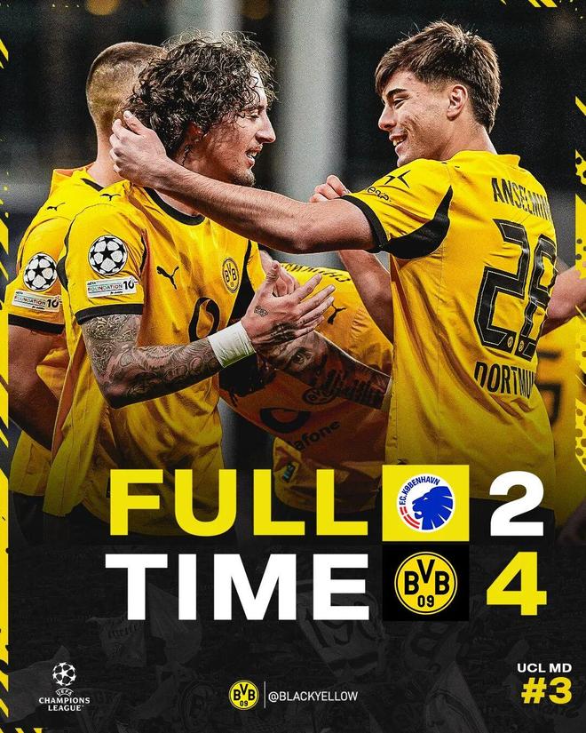 2025年10月22日 欧冠两连胜!多特4-2哥本哈根 恩梅查梅开二度本塞拜尼点射